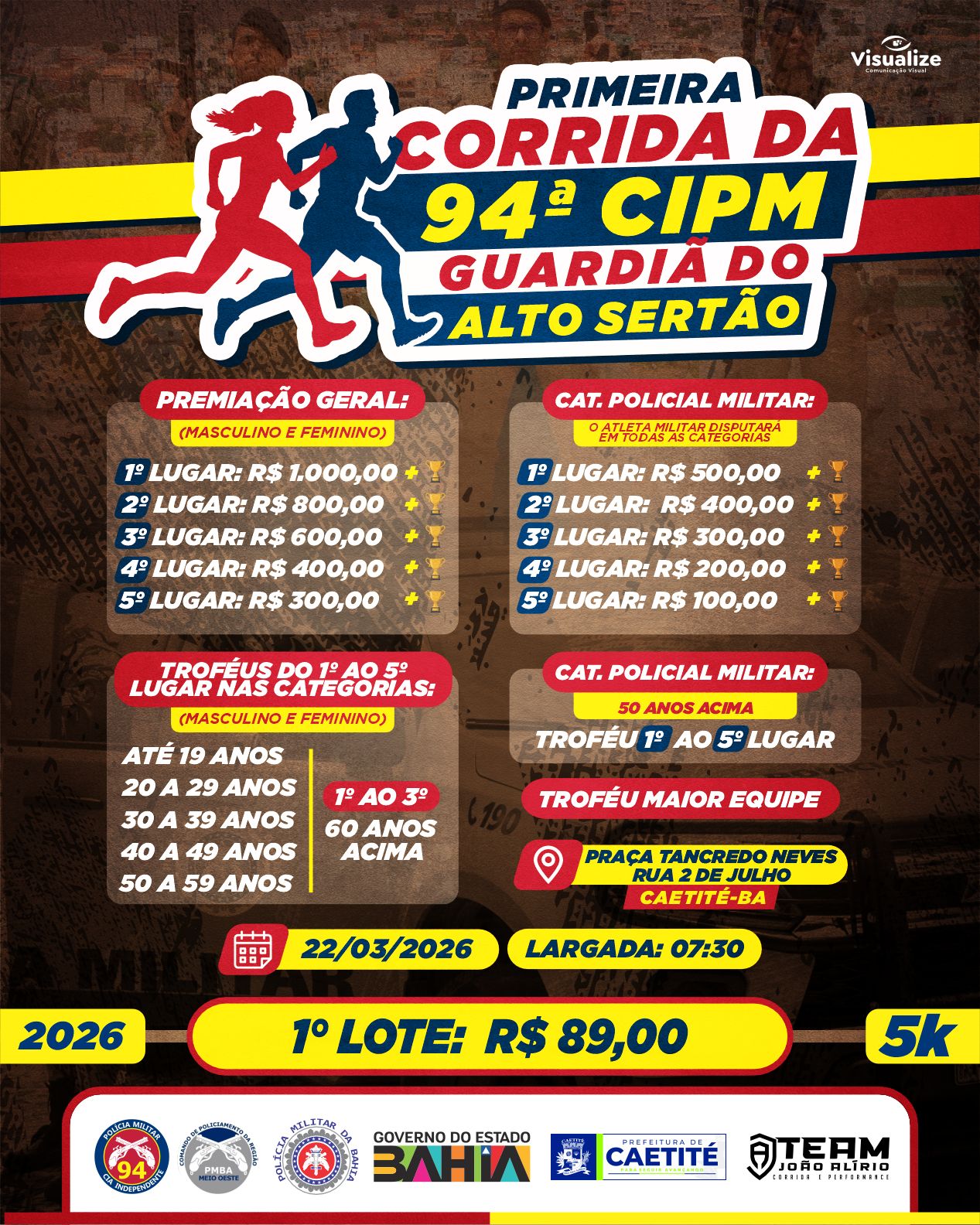 1.3 A 1ª Corrida da 94ª CIPM em Caetité-Ba será realizada no dia 22 de Março de 2026 (domingo), com largada e chegada na praça Tancredo Neves, com percurso de 5 km.